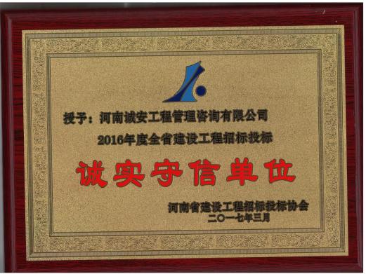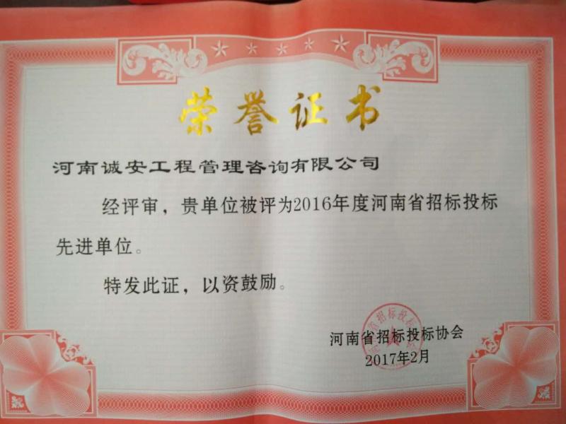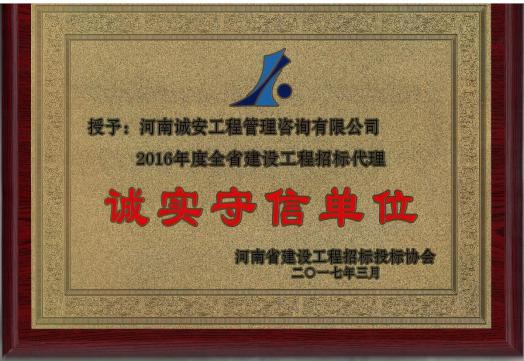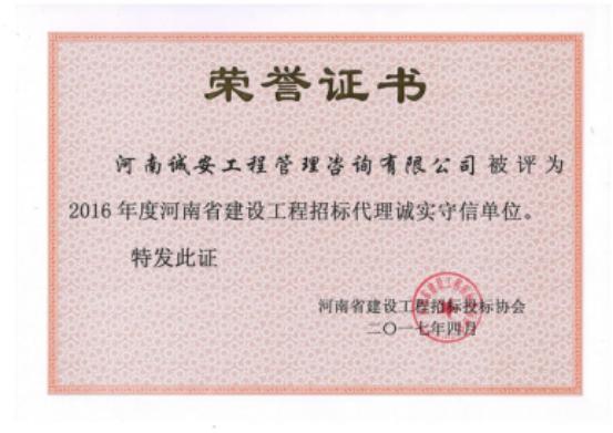 河南誠安分獲河南省招標投標協(xié)會2016年度招標投標先進單位及河南省建設監(jiān)理協(xié)會2016年度招標投標誠實守信單位