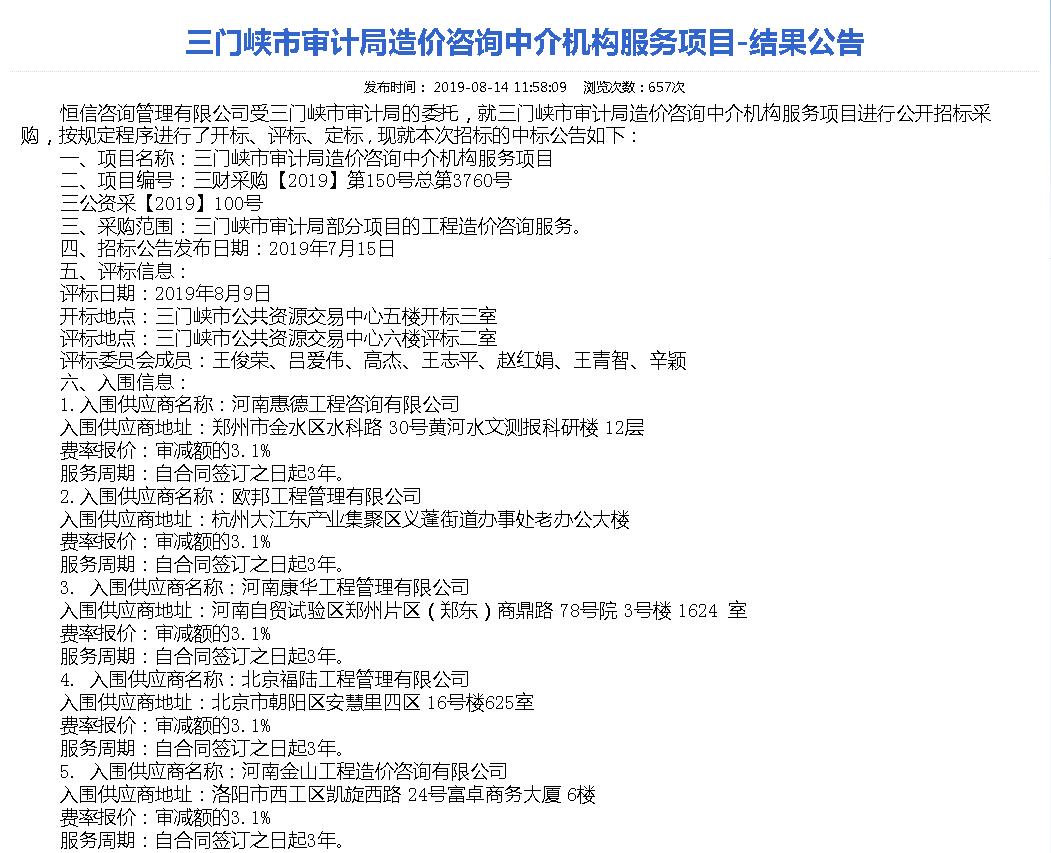 賀!河南誠安入圍三門峽市審計局造價咨詢中介機(jī)構(gòu)服務(wù)項目