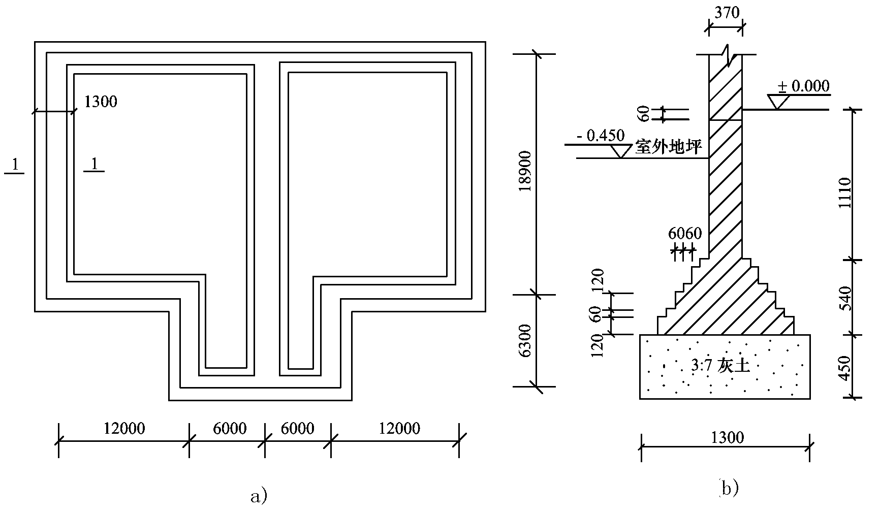 (2)用M5的水泥砂漿砌筑磚基礎(chǔ),磚基礎(chǔ)寬370 m m,為三高三低的不等高大放腳。