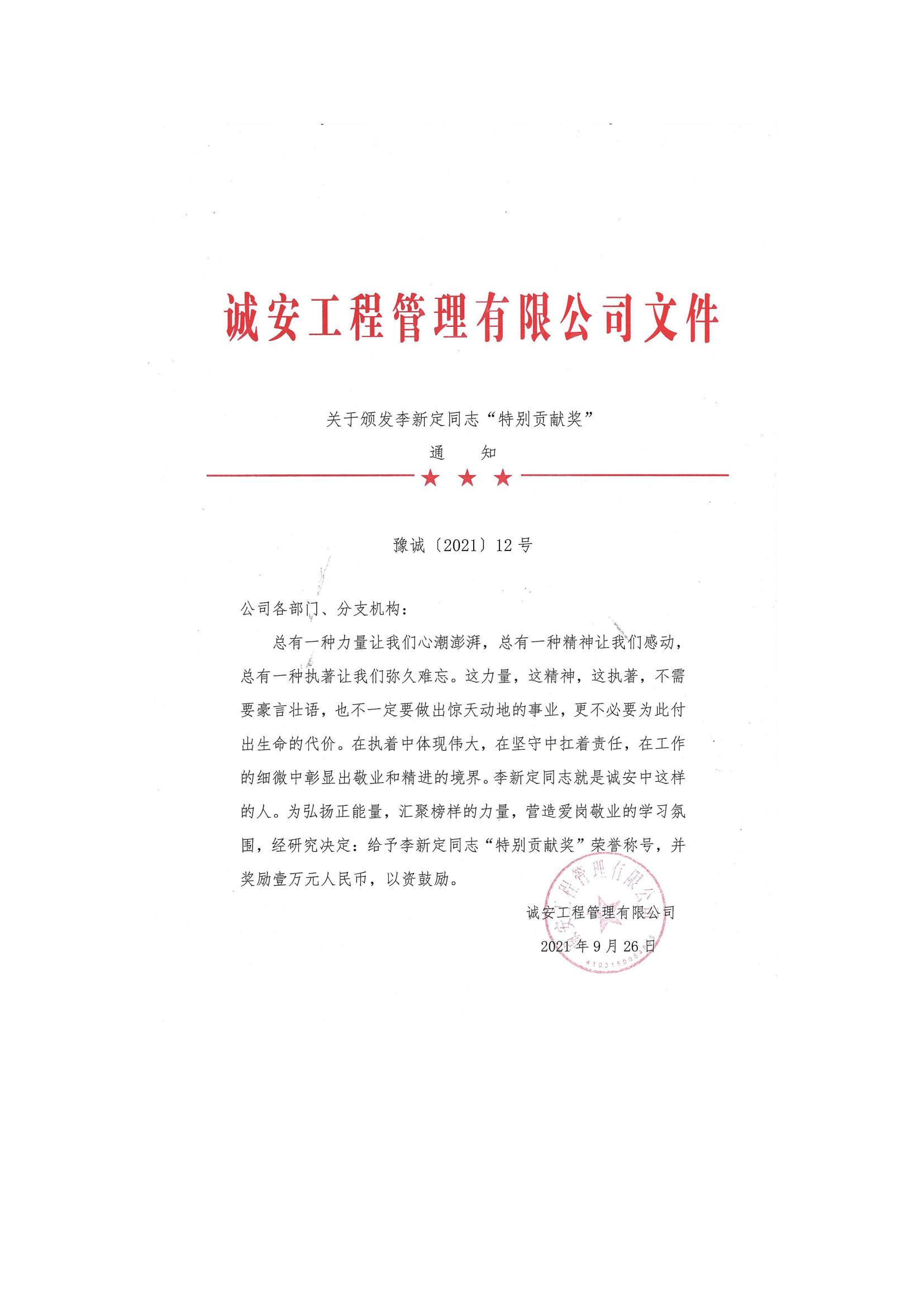 關(guān)于頒發(fā)李新定通知‘特別貢獻(xiàn)獎’的通知